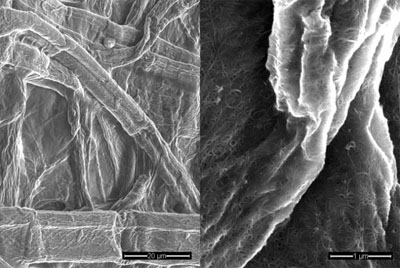 左:電子顯微鏡掃描下的普通紙張;右:涂上碳納米管墨水的紙張。