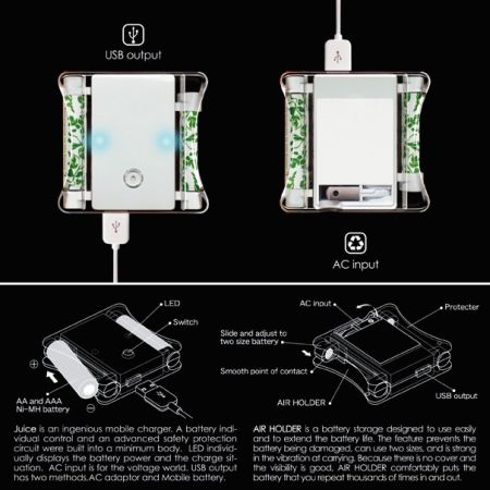 這款充電器有兩個(gè)接口,可以通過普通電源或是USB接口給充電電池補(bǔ)充電量。也正因?yàn)橛辛薝SB充電接口,它還能給各種電子設(shè)備補(bǔ)充電量。而放置充電電池的凹槽也可以進(jìn)行調(diào)整,能夠?yàn)?號和7號電池充電。