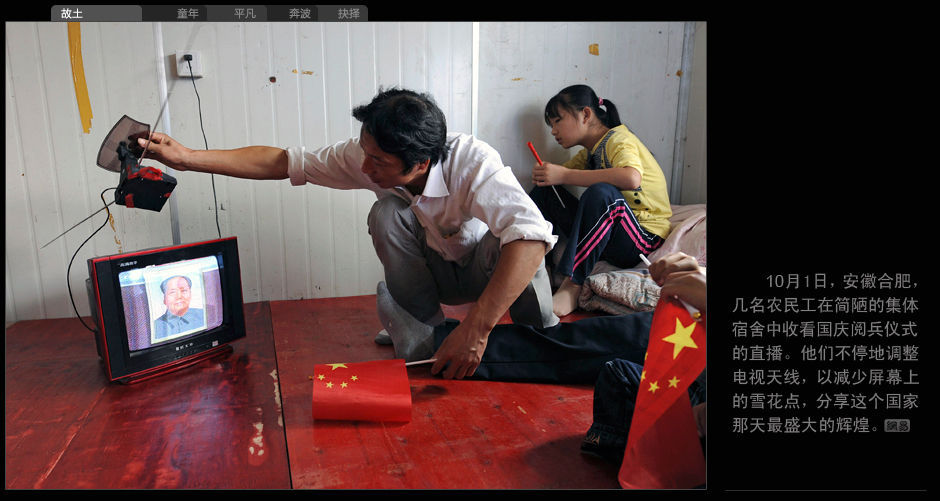 10月1日,安徽合肥,幾位農(nóng)民工在簡陋的集體宿舍中收看國慶閱兵儀式的直播。他們不停地調(diào)整電視天線,以減少屏幕上的雪花點,分享這個國家那天最盛大的輝煌。