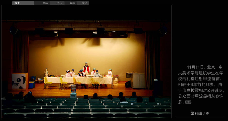 11月11日,北京,中央美術(shù)學(xué)院組織學(xué)生在學(xué)校的禮堂注射甲流疫苗。相較于6年前的非典,由于信息披露相對公開透明,公眾面對甲流顯得從容許多。 梁利峰/攝