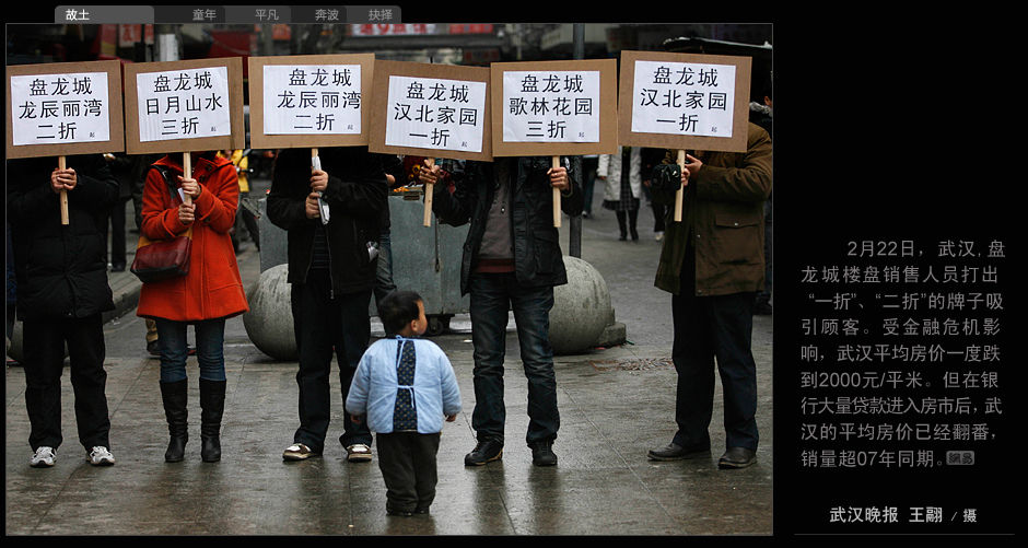 2月22日,武漢,盤龍城樓盤銷售人員打出“一折”、“二折”的牌子吸引顧客,受金融危機(jī)影響,武漢平均房價一度跌倒2000元/平米。但在銀行大量貸款進(jìn)入房市后,武漢的平均房價已經(jīng)翻番,銷量超過07年同期。 武漢晚報 王翮 攝