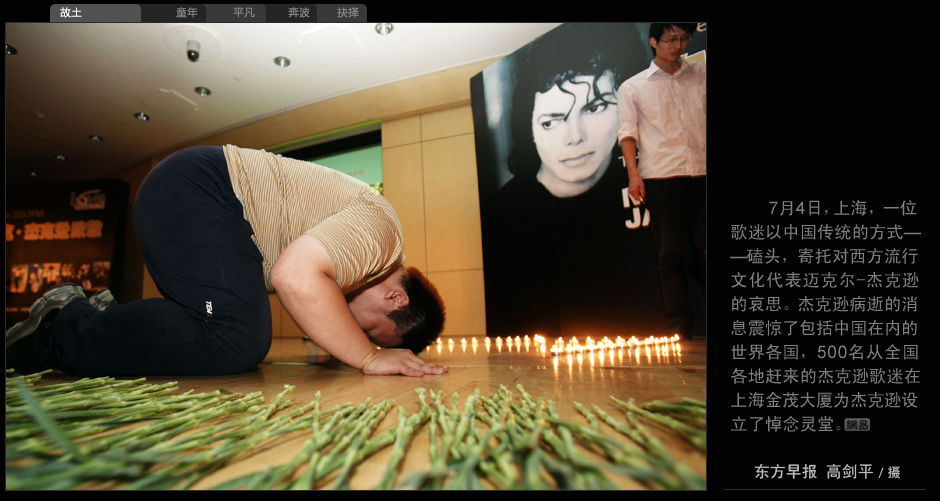 7月4日,上海,一位歌迷以中國傳統(tǒng)的方式——磕頭,寄托對西方流行文化代表邁克爾·杰克遜的哀思。杰克遜病逝的消息震驚了包括中國在內(nèi)的世界各國,500名從全國各地趕來的杰克遜歌迷在上海金茂大廈為杰克遜設(shè)立了悼念靈堂。 東方早報 髙劍平 攝