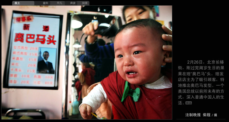 2月26日,北京長椿街,剛過完周歲生日的果果在理“奧巴馬”頭。理發(fā)店店主為了吸引顧客,特地推出奧巴馬發(fā)型,一個美國總統(tǒng)以前所未有的方式,深入普通中國人的生活。 法制晚報 柴程 攝