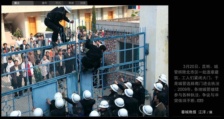 3月20日,昆明,城管拆除北市區(qū)一處違章建筑。工人們緊閉大門,于是城管選擇爬門進(jìn)去執(zhí)法。2009年,各地城管繼續(xù)參與各種執(zhí)法,爭議與沖突依舊不斷。春城晚報 江洋 攝
