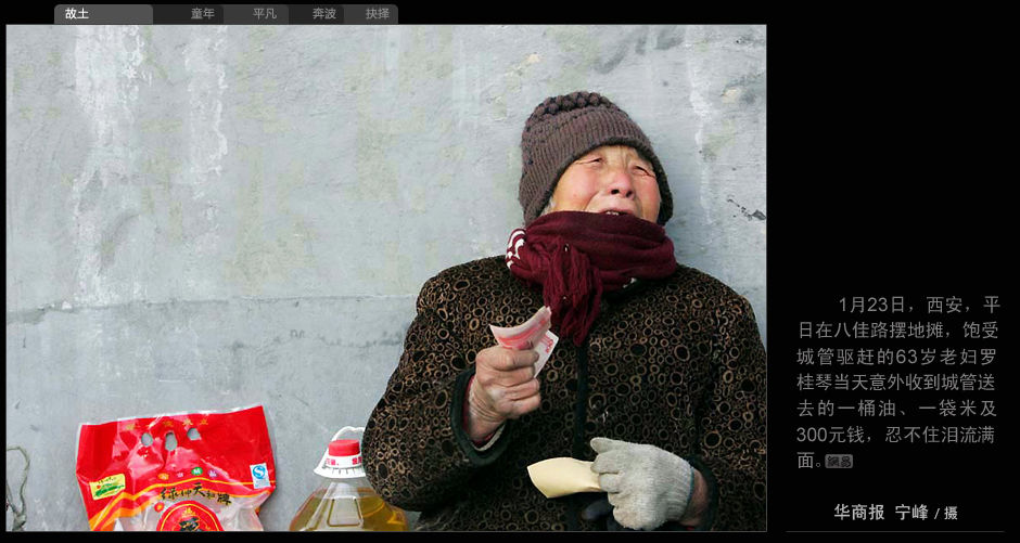 1月23日,西安,平日在八佳路擺地攤,,飽受城管驅(qū)趕的63歲老婦羅桂琴當(dāng)天意外收到城管送去的一桶油、一袋米及300元錢,忍不住淚流滿面。 華商報 寧峰 攝