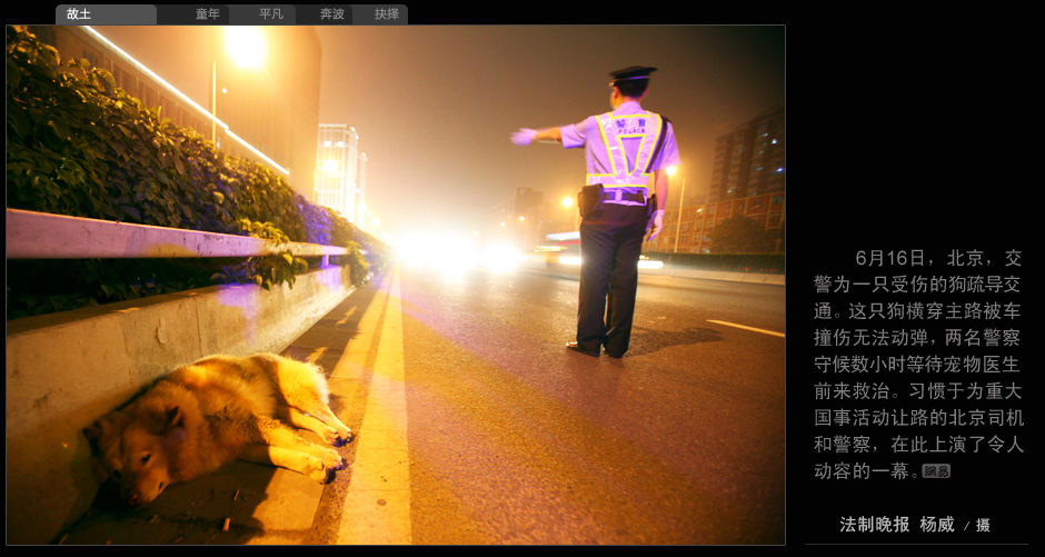 6月16日,北京,交警為一只受傷的狗疏導(dǎo)交通。這只狗橫穿主路被車撞傷無法動彈,兩名警察守候數(shù)小時等待寵物醫(yī)生前來救治。習(xí)慣于為重大國事活動讓路的北京司機(jī)和警察,在此上演了令人動容的一幕。 法制晚報 揚(yáng)威 攝