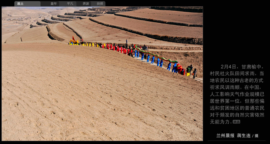 2月4日,甘肅榆中,村民社火隊田間求雨,當(dāng)?shù)剞r(nóng)民以這種古老的方式祈求風(fēng)調(diào)雨順。在中國,人工影響天氣作業(yè)規(guī)模已居世界第一位,但那些偏遠(yuǎn)和貧困地區(qū)的普通農(nóng)民對于頻發(fā)的自然災(zāi)害依然無能為力。 蘭州晨報 蔣生連 攝