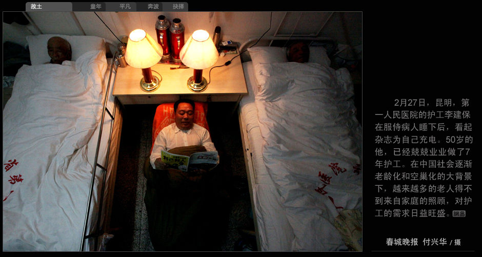 2月27日,昆明,第一人民醫(yī)院的護(hù)工李建保在服侍病人睡下后,看起雜志為自己充電。50歲的他,已經(jīng)兢兢業(yè)業(yè)做了7年護(hù)工。在中國社會逐漸老齡化和空巢化的大背景下,越來越多的老人得不到來自家庭的照顧,對護(hù)工的需求日益旺盛。 春城晚報 付興華 攝