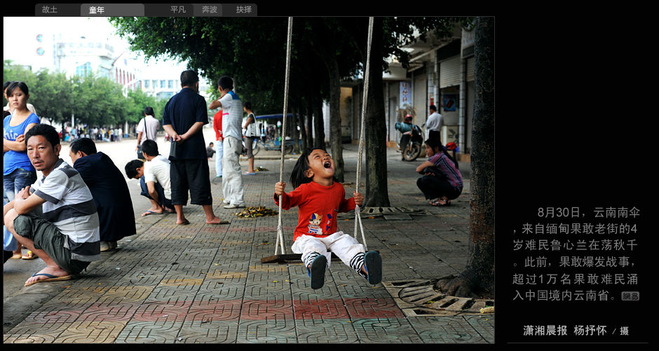 8月30日,云南南傘,來自緬甸果敢老街的4歲難民魯心蘭在蕩秋千。此前,果敢爆發戰事,超過1萬名果敢難民涌入中國境內云南省。(瀟湘晨報 楊抒懷/攝)