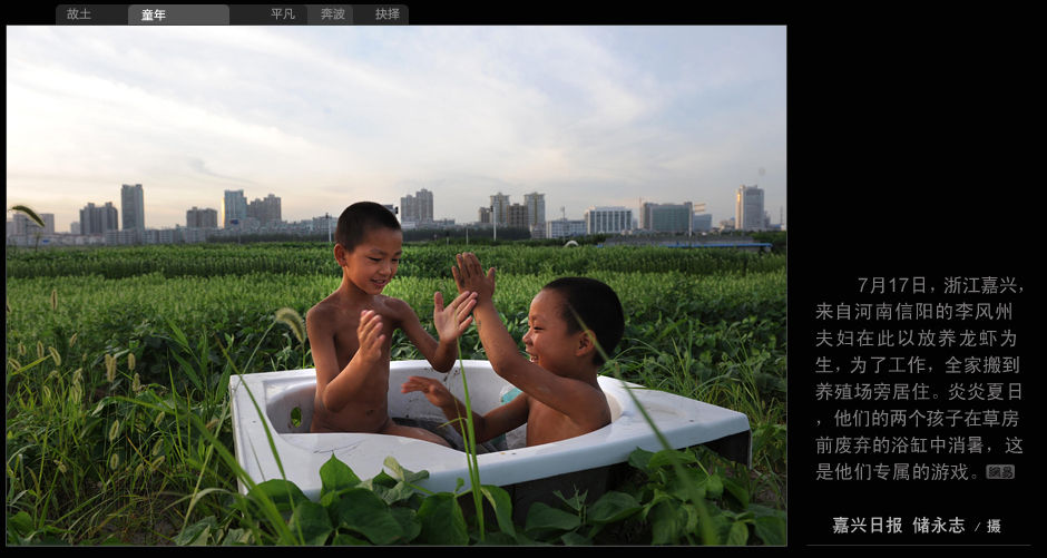 7月17日,浙江嘉興,來自河南信陽的李風州夫婦在此以放養龍蝦為生,為了工作,全家搬到養殖場旁居住。炎炎夏日,他們的兩個孩子在草房前廢棄的浴缸中消暑,這是他們專屬的游戲。(嘉興日報 儲永志/攝)