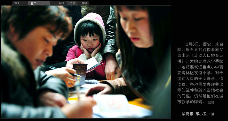 2月8日,西安,來自陜西周至縣的召俊看著父母出示《流動人口婚育證明》,為她辦理入學手續。她將要就讀重點小學西安碑林區友誼小學。對于流動人口的子女來說,借讀費、各種需要辦理并出示的證件和融入當地社會的門檻,仍然是他們在城市就學的障礙。(華商報 鄧小衛/攝)
