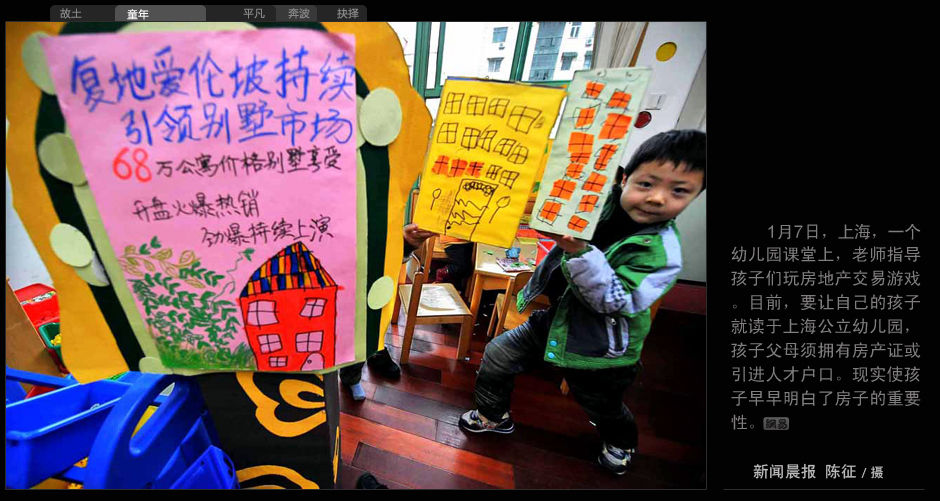 1月7日,上海,一個幼兒園課堂上,老師指導孩子們玩房地產交易游戲。目前,要讓自己的孩子就讀于上海公立幼兒園,孩子父母須擁有房產證或引進人才戶口。現實使孩子早早明白了房子的重要性。 新聞晨報 陳征 攝