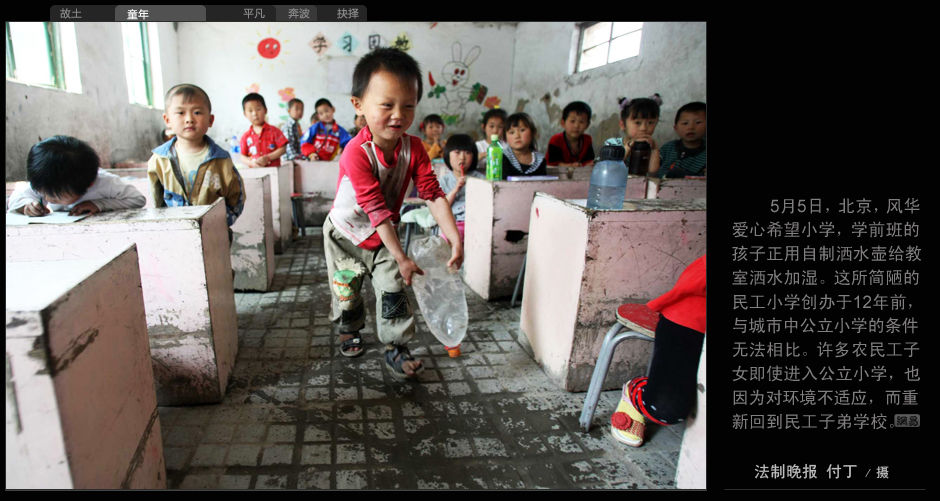 5月15日,北京,風華愛心希望小學,學前班的孩子正用自制灑水壺給教室灑水加濕。這所簡陋的民工小學創立于12年前,與城市中公立小學的條件無法相比。許多農民工子女即使進入公立小學,也因為對環境不適應,而重新回到民工子弟學校。(法制晚報 付丁/攝)