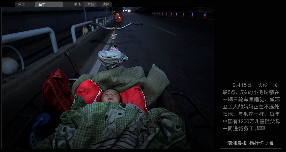 9月15日,長沙,凌晨5點,5歲的小毛坨躺在一輛三輪車里睡覺,做環衛工人的媽媽正在不遠處掃地。與毛坨一樣,每年中國有1200萬兒童隨父母一同進城務工。(瀟湘晨報 楊抒懷/攝)
