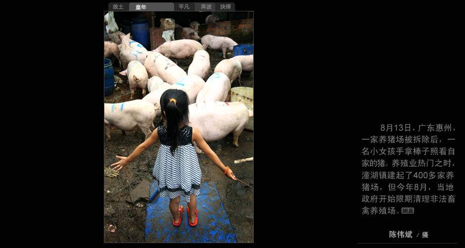 8月13日,廣東惠州,一家養豬場被拆除后,一名小女孩拿棒子照看自己的豬。養殖業熱門之時,潼湖鎮建起了400多家養豬場,但今年8月,當地政府開始限制清理非法畜禽養殖場。 陳偉斌 攝
