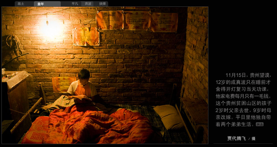 11月15日,貴州望謨,12歲的成真波只在睡前才舍得開燈復習當天功課,他家電費每月只有一毛錢。這個貴州貧困山區的孩子2歲時父親去世,9歲時母親改嫁。平日里他獨自帶著兩個弟弟生活。(賈代騰飛/攝)