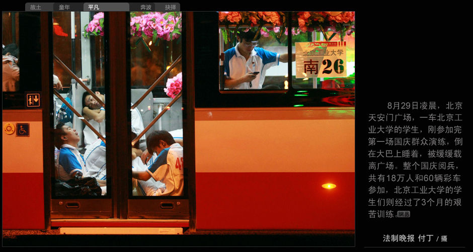 8月29日凌晨,北京天安門廣場,一車北京工業大學的學生,剛參加完第一場國慶群眾演練,倒在大巴上睡著,被緩緩載離廣場。整個國慶閱兵,共有18萬人和60輛彩車參加,北京工業大學的學生們則經過了3個月的艱苦訓練。(法制晚報 付丁/攝)