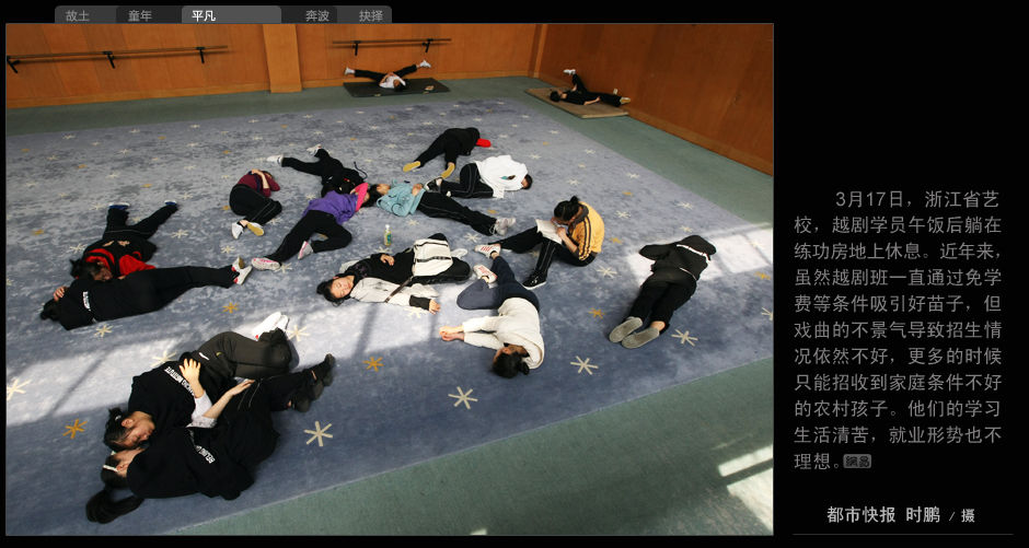 3月17日,浙江省藝校,越劇學員午飯后躺在練功房地上休息。近年來,雖然越劇班一直通過免學費等條件吸引好苗子,但戲劇的不景氣導致招生情況依然不好,更多的時候只能招收到家庭條件不好的農村孩子。他們的學習生活清苦,就業形勢也不理想。(都市快報 時鵬/攝)