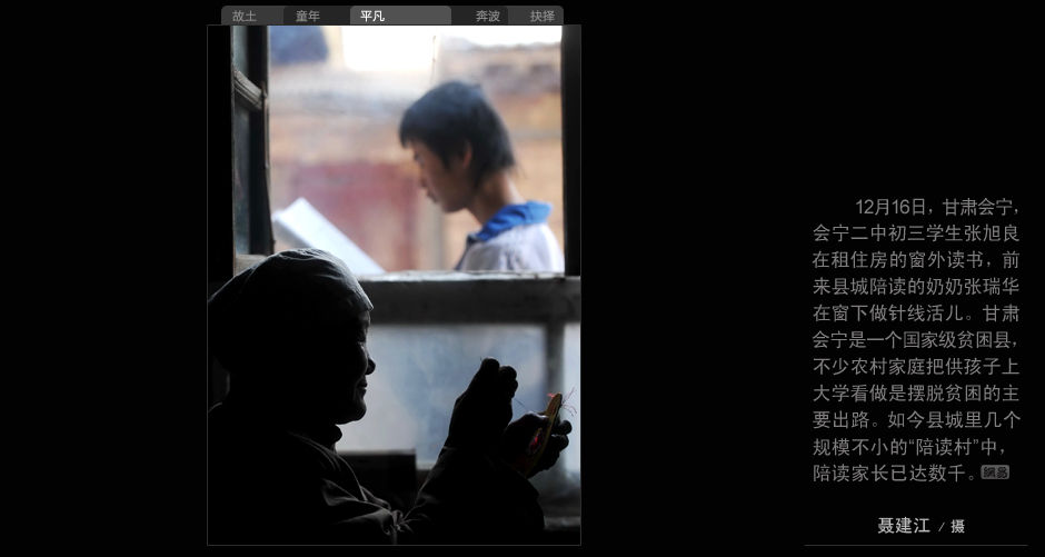 12月16日,甘肅會寧,會寧二中初三學生張旭良在租住房的窗外讀書,前來縣城陪讀的奶奶張瑞華在窗下做針線活兒。甘肅會寧是一個國家級貧困縣,不少農村家庭把供孩子上大學看做是擺脫貧困的主要出路。如今縣城里幾個規模不小的“陪讀村”中,陪讀家長已達數千。(聶建江/攝)
