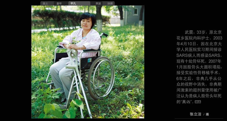 武震,33歲,原北京花鄉醫院內科護士。2003年4月10日,因在北京大學人民醫院實習期間接診SARS病人而感染SARS,現有十處骨壞死。2007年1月因股骨頭大面積塌陷,接受實驗性骨移植手術。6年之后,非典幾乎從公眾的視野中消失。非典期間激素的超劑量使用被廣泛認為是病人股骨頭壞死的“真兇”。(張立潔/攝)