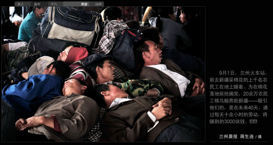 9月1日,蘭州火車站,前去新疆采棉花的上千名農民工在地上睡著。為在棉花落地前搶摘完,20余萬農民工候鳥般奔赴新疆——吸引他們的,是在未來40天,通過每天十余小時的勞動,將賺到3000塊錢。(蘭州晨報 蔣生連/攝)