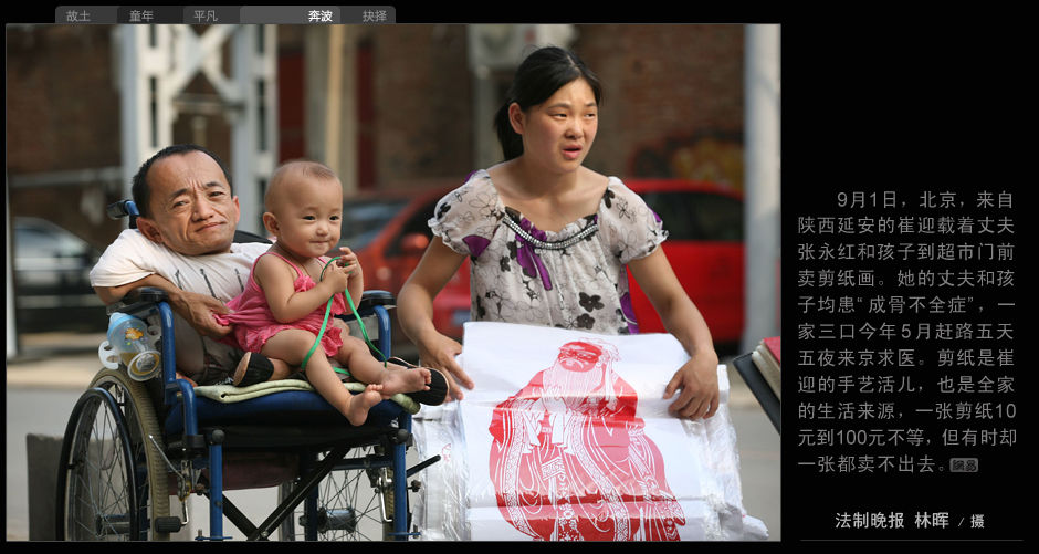 9月1日,北京,來自陜西延安的崔迎載著丈夫張永紅和孩子到超市門前賣剪紙畫。她的丈夫和孩子均患“成骨不全癥”,一家三口今年5月趕路五天五夜來京求醫。剪紙是崔迎的手藝活兒,也是全家的生活來源,一張剪紙10元到100元不等,但有時卻一張都賣不出去。(法制晚報 林暉/攝)