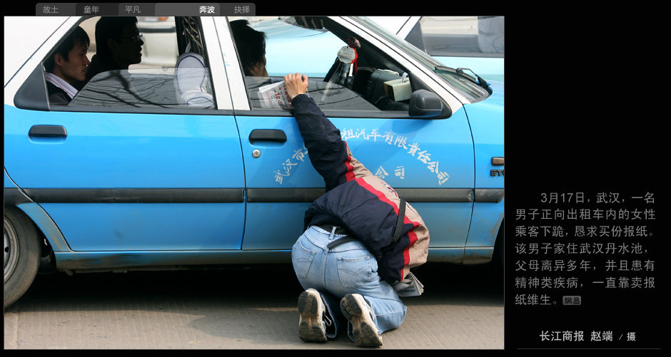 3月17日,武漢,一名男子正向出租車內的女性乘客下跪,懇求買份報紙。該男子家住武漢丹水池,父母離異多年,并且患有精神類疾病,一直靠賣報紙為生。(長江商報 趙瑞/攝)