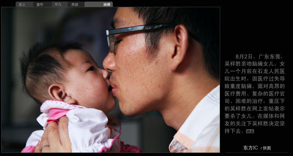 8月2日,廣東東莞,吳樣勝親吻腦癱女兒。女兒一個月前在石龍人民醫院出生時,因醫療過失導致重度腦癱。面對高昂的醫療費用、復雜的醫療官司、困難的治療,重壓下的吳樣勝在網上發帖表示要殺了女兒。在媒體和網友的關注下吳樣勝決定堅持下去。(東方IC/供圖)