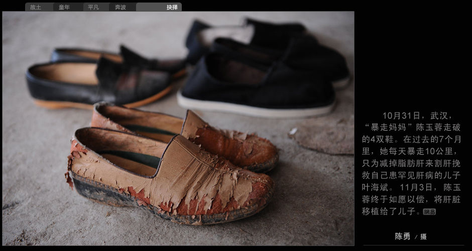 10月31日,武漢,“暴走媽媽”陳玉蓉走破的第4雙鞋,在過去的7個月里她每天暴走10公里,只為減掉脂肪肝來割肝挽救自己患罕見肝病的兒子葉海斌。11月3日,陳玉蓉終于如愿以償,將肝臟移植給了兒子。 陳勇 攝