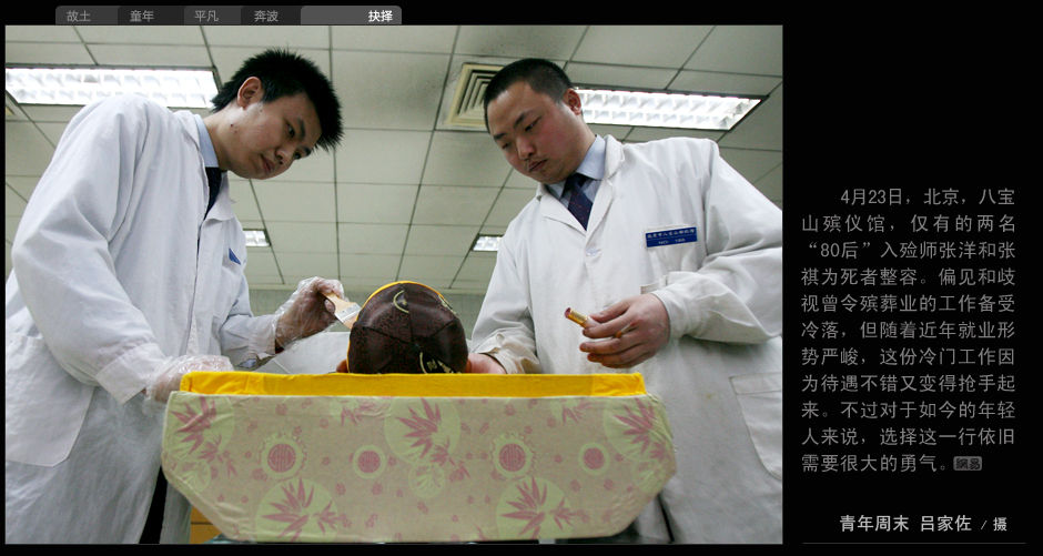 4月23日,北京,八寶山殯儀館,僅有的兩名“80后”入殮師張洋和張祺為死者整容。偏見和歧視曾令殯葬業的工作備受冷落,但隨著近幾年就業形勢嚴峻,這份冷門工作因為待遇不錯又變得槍手起來。不過對于如今的年輕人來說,選擇這一行依舊需要很大的勇氣。 (青年周末 呂家佐/攝)