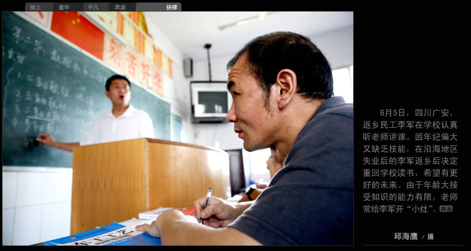 6月5日,四川廣安,返鄉民工李軍在學校認真聽老師講課,因年紀偏大又缺乏技能,在沿海地區失業后的李軍返鄉后決定重回學校讀書,希望有更好的未來。由于年齡大接受知識的能力有限,老師常給李軍開“小灶”。 邱海鷹 攝