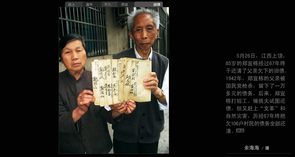 5月26日,江西上饒,85歲的鄭宣棟經過67年終于還清了父親欠下的舊債。1942年,鄭宣棟的父親被國名黨槍殺,留下了一萬多元的債務。后來,鄭宣棟打短工、做挑夫試圖還債,但又趕上了“文革”和自然災害,歷經67年終于把欠106戶村民的債務全部還清。 余海海 攝