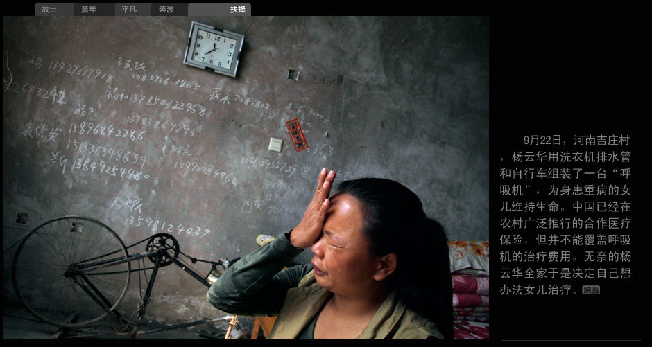 9月22日,河南吉莊村,楊云華用洗衣機排水管和自行車組裝了一臺“呼吸機”,為身患重病的女兒維持生命。中國已經在農村廣泛推廣合作醫療保險,但并不能覆蓋呼吸機的治療費用。無奈的楊云華全家于是決定自己想辦法為女兒治療。
