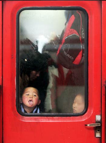 2月3日,武昌火車站,5歲的姐姐羅晶晶和2歲半的弟弟羅再華,跟著去東莞打工的父母一同擠上了春運的火車。2009年春運期間,中國共有1.92億人乘坐火車。每年這個時候為了“回家看看”,成千上萬的農民工,帶著他們的孩子遷徙于農村和城市之間。(長江商報 田振龍/攝)