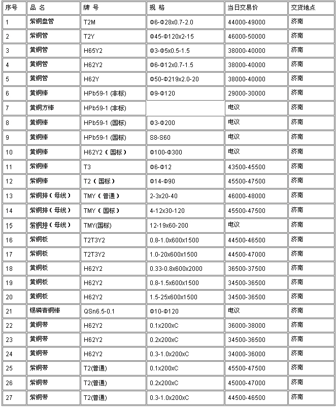 山東地區有色金屬7月13日銅材料交易價