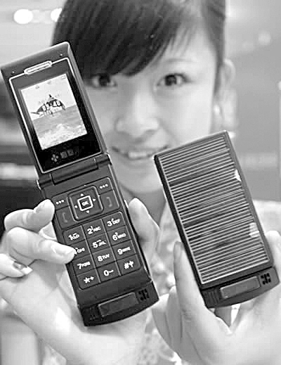 題圖:2007年5月,全球首部光能手機在中國問世。手機機身表面被太陽能電池板覆蓋,在陽光、陰天、燈光、燭光下可隨時為手機鋰電池充電,從而有效地節省能源。