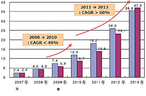 2007-2013年全球薄膜太陽能電池市場預測 單位:MW