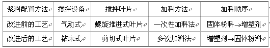 對(duì)漿料制備工藝的改進(jìn)從如表2所示的四個(gè)方面進(jìn)行了比較: