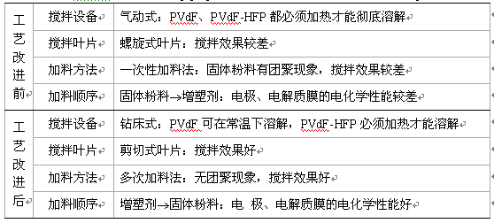 工藝改進(jìn)取得較好效果:采用可控速鉆床式攪拌設(shè)備、剪切式攪拌葉輪,并采用多次加料法,攪拌效果很好;增塑劑在固體粉料之前加入,所制得的電極、電解質(zhì)膜具有較好的機(jī)械性能及電化學(xué)性能;