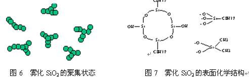 此時(shí)若再加入無機(jī)填料霧化硅石,根據(jù)聚合物中填料的表面效應(yīng),霧化SiO2的表面將強(qiáng)烈地吸附分子鏈。霧化硅石是一種無定形態(tài)的納米多孔SiO2的聚集體,其結(jié)構(gòu)形狀如圖6所示。這樣,在一個(gè)SiO2粒子的表面就可連接幾條分子鏈,使分子鏈間 形成物理交聯(lián)。同時(shí)還由于霧化SiO2 在制備過程中其表面會(huì)形成大量羥基-OH(見圖7),-OH與PVdF及PVdF-HFP分子鏈上的氟原子將形成強(qiáng)烈的氫鍵,從而又能形成鏈間的化學(xué)交聯(lián)。這樣就構(gòu)成了PVdF體系、PVdF-HFP體系的高分子網(wǎng)絡(luò),溶劑與增塑劑都分布在這種高分子網(wǎng)絡(luò)中。