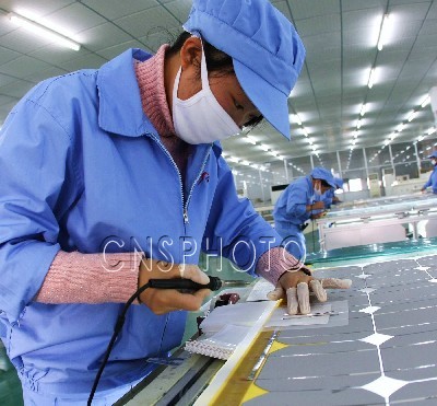 2009年12月3日,江蘇省海安縣一太陽能電池生產企業車間一角。(配圖)