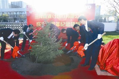 11月9日,三洋能源(北京)有限公司廠區內,董事長后藤勝城與總經理林佳彥一起揭開了標有“公司成立十周年,紀念植樹”的石牌,各分公司經理參加植樹儀式一起揮鍬鏟土種下了一株常青樹,拉開了三洋能源(北京)有限公司慶典的序幕。