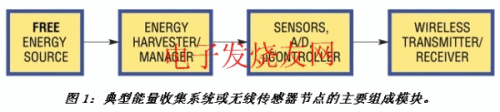 典型的能量收集配置或無線傳感器節(jié)點由4個模塊組成(見圖1)。它們是:1、一個環(huán)境能量源,比如:太陽能電池;2、一個用于給節(jié)點的其余部分供電的功率轉(zhuǎn)換組件;3、一個將節(jié)點鏈接到現(xiàn)實世界的感測組件以及一個計算組件(由微處理器或微控制器組成,負(fù)責(zé)處理測量數(shù)據(jù)并將這些數(shù)據(jù)存貯到存儲器中);4、一個由短程無線單元組成的通信組件,用于實現(xiàn)與相鄰節(jié)點及外部世界的無線通信。