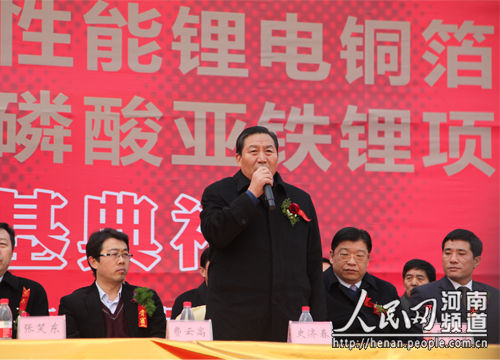 人民網安陽12月19日專電 12月18日上午,河南紅日投資集團年產1萬噸高性能鋰電銅箔、年產1萬噸磷酸亞鐵鋰項目開工奠基儀式在安陽市(北關)紡織產業集聚區隆重舉行。河南省副省長史濟春、國家高科技節能減排促進中心常務副主任馬強、安陽市市委書記張廣智、市長張笑東等重要領導出席了儀式,并為該項目共同奠基培土。