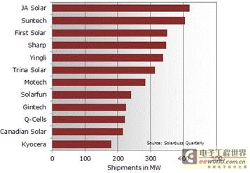 在這些廠商中,排名首位的是來自中國的晶澳太陽能(JA Solar),出貨量占全球8%;緊追在后的二、三名廠商分別為尚德(Suntech Power)和First Solar。