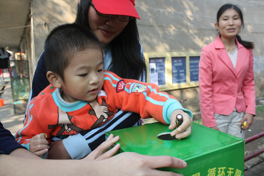 在云麓園校區活動現場記者看到,附近居民紛紛拿出家中的廢舊電池投入收集箱內。“早就聽說廢舊電池污染嚴重,今天有機會特意帶著小孫子過來把家中的電池捐出來。”附近的居民張嗲嗲提著一大袋子電池說道。
