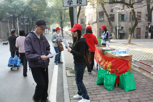 圖為中南大學(xué)志愿者正在進(jìn)社區(qū)宣傳和收集廢舊電池。