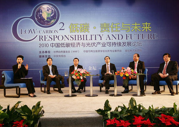 本次論壇由世界自然基金會、中國可再生能源學(xué)會、金壇市人民政府共同主辦,得到了中央電視臺財經(jīng)頻道的鼎力支持。本次論壇的主題是《低碳:責(zé)任與未來》。與會的世界自然基金會(WWF)北京副首席代表李琳,國務(wù)院參事、中國可再生能源學(xué)會理事長石定寰,國家統(tǒng)計局總經(jīng)濟師姚景源,中國可再生能源學(xué)會副理事長趙玉文,國家發(fā)改委能源研究所副所長李俊峰以及中國光伏行業(yè)的數(shù)十名龍頭企業(yè)家,就《“結(jié)構(gòu)調(diào)整”背景下的2010年中國宏觀經(jīng)濟形勢》《世界低碳經(jīng)濟走勢預(yù)測》《國際新能源發(fā)展市場與中國機會》《中國節(jié)能發(fā)展低碳經(jīng)濟的實踐與展望》《從光伏發(fā)展看區(qū)域經(jīng)濟的轉(zhuǎn)型升級》《陽光電能離我們有多遠?》《低碳是誰的機會?》《尋找“低碳先鋒”》等十大專題進行了一場智慧對話和深入研討,一同尋找和構(gòu)劃第四次產(chǎn)業(yè)革命時代——低碳經(jīng)濟變革時代的“中國機會”。