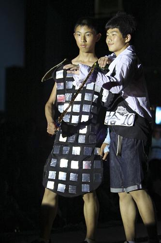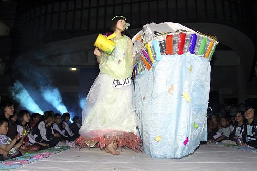 5月24日晚,浙江嘉善縣泗洲中學(xué)的學(xué)生在T臺上展示自己設(shè)計制作的“環(huán)保時裝”。