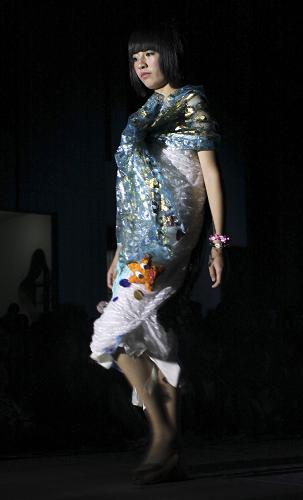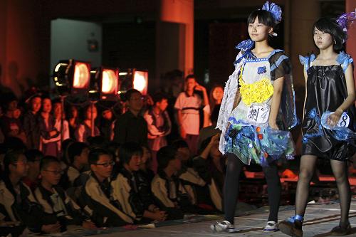 當晚,該校105名學(xué)生“模特”展示了用廢光盤、塑料袋、廢舊磁帶、一次性桌布等材料自制的“環(huán)保時裝”。